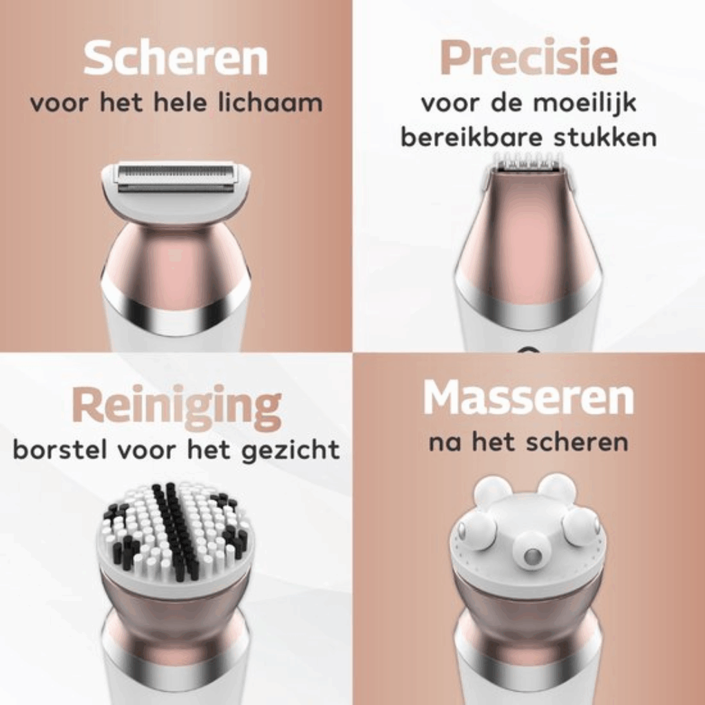 De 4-in-1 functionaliteit is geen marketingtruc. De brede scheerkop is ideaal voor grotere oppervlakken zoals benen en armen, terwijl het kleine precisie-opzetstuk perfect werkt voor oksels, bikinilijn en zelfs het gezicht. Eén apparaat dat je hele routine afdekt — dat is echt een verademing.