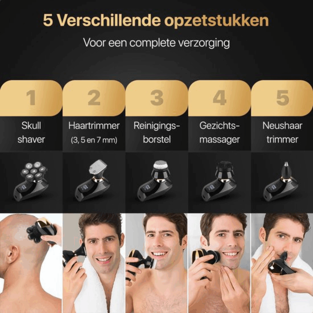 De Wellshave 5-in-1 Shaving Kit Deluxe is niet zomaar een scheerapparaat, maar een complete groomingtool. Of je nu je hoofd kaal scheert, je baard strak bijhoudt of je huid wilt verzorgen — dit apparaat combineert alles in één compact ontwerp.